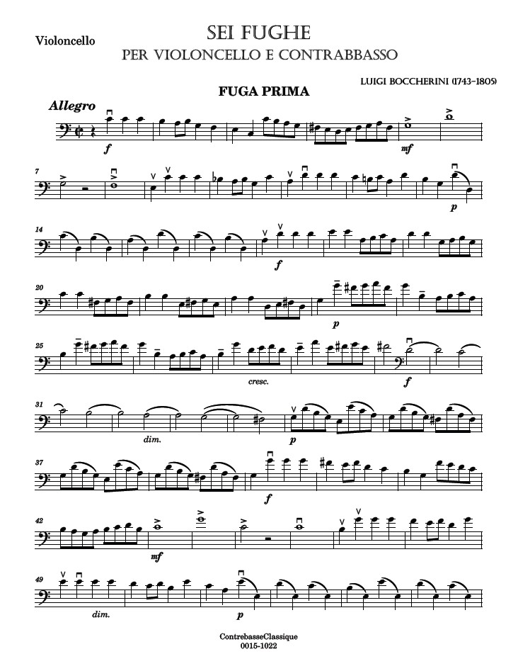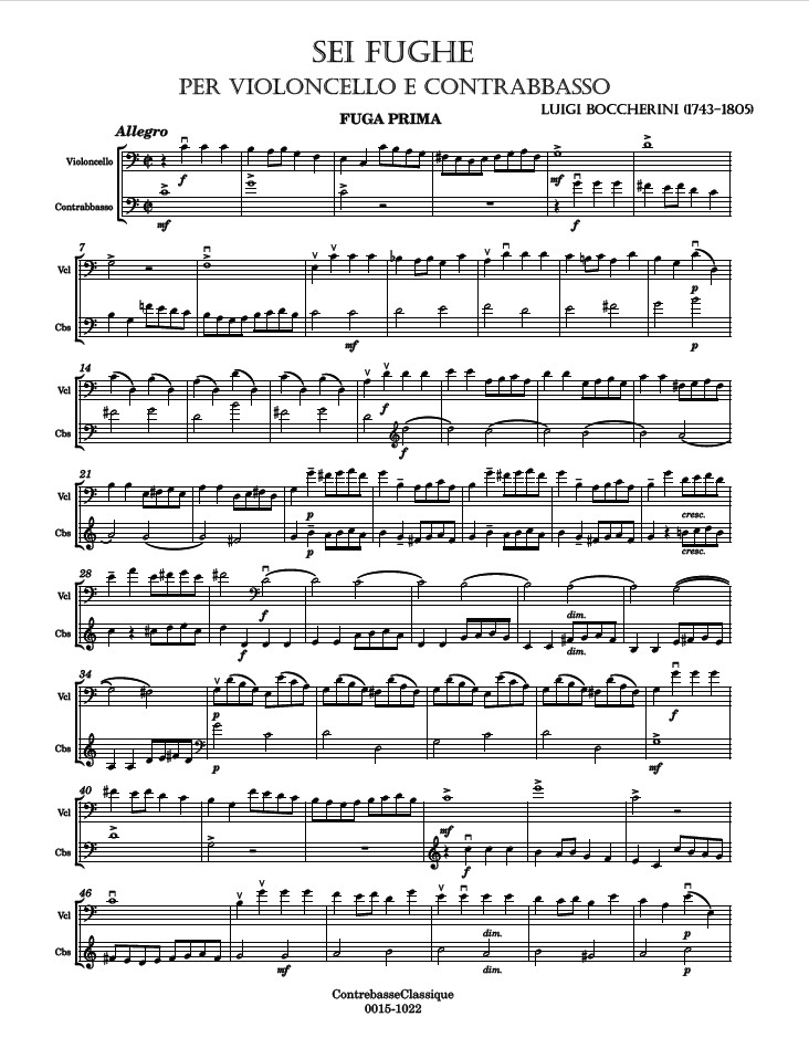 - Particularités de cette partition : Boccherini a joué ces Fugues avec son père, qui était contrebassiste. Toutefois, elles ont toujours été publiées pour deux violoncelles. Cette version présente donc la partie de deuxième violoncelle à l’octave supérieure, pour faciliter la lecture des contrebassistes.