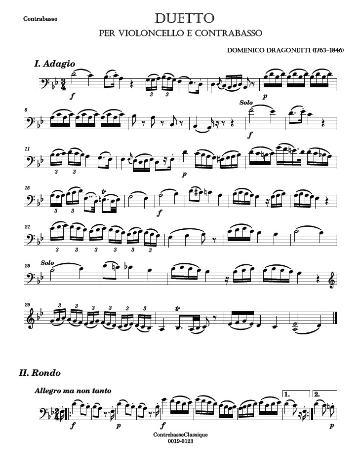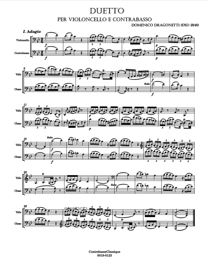 - Particularités de cette partition : Ce Duetto a probablement été composé après 1794, lorsque Dragonetti s’est installé à Londres et a entamé une longue collaboration musicale avec le violoncelliste anglais Robert Lindley.