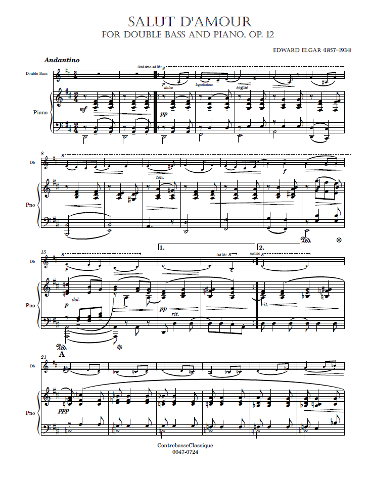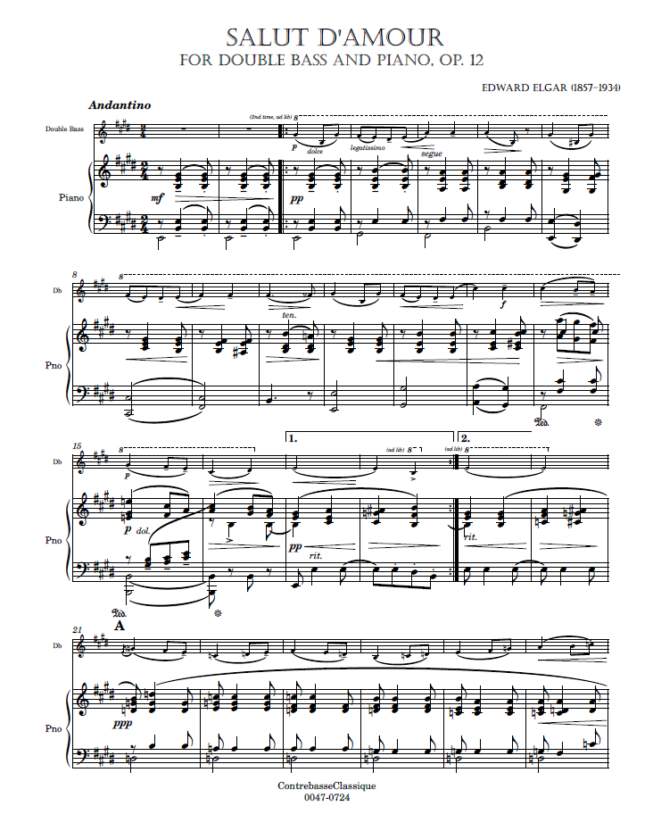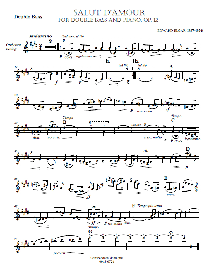 - Special features of this score: This piece was originally written for violin and piano. It has been transcribed for many instruments. Includes two double bass parts, for orchestra tuning and solo tuning, and two piano parts (E major and D major).