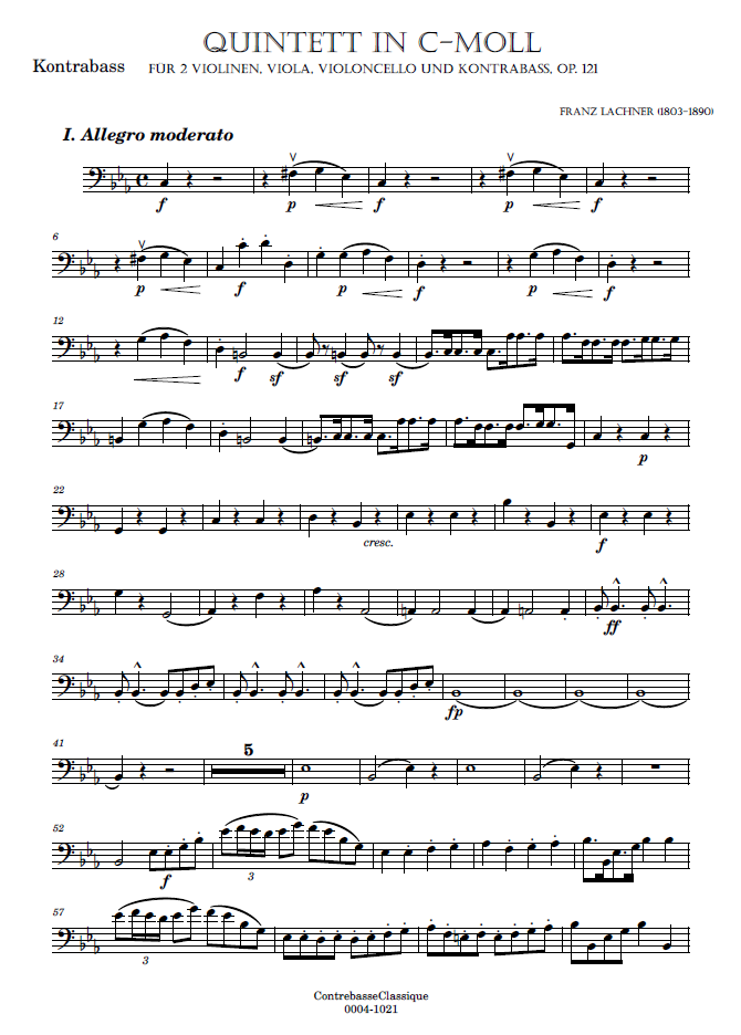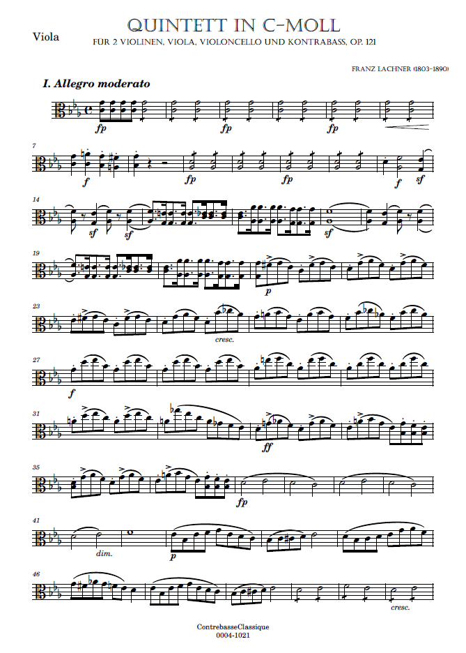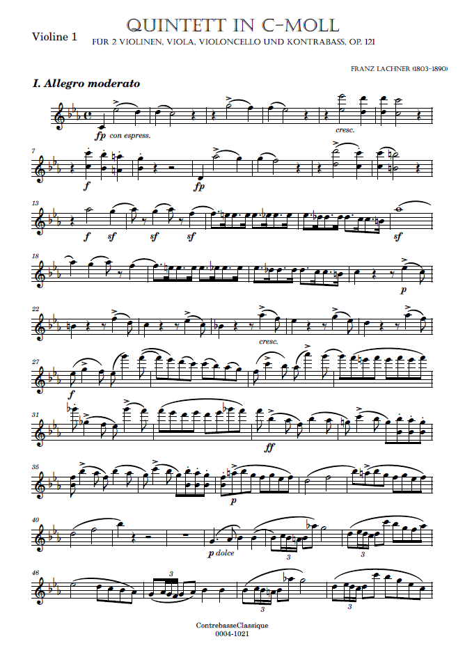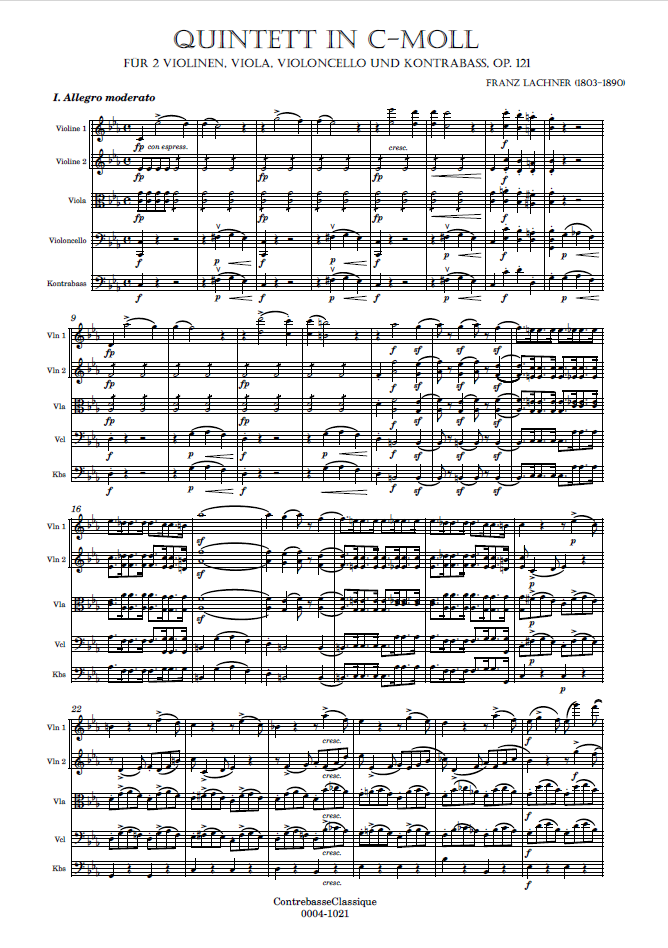 - Special features of this score: Lachner composed this string quintet in Vienna in April 1834 for string quartet and double bass. In 1866, before submitting it to his publisher, he completely revised the score and replaced the double bass with a second cello. The Walter Wollenweber publishing house is the only one to publish the version with double bass. When it was published, the idea was to offer the original version of this string quintet for the first time. However, it should be noted that in this version, Lachner’s revisions have been retained, notably the addition of contrapuntal elements to replace certain octave passages in the cello and double bass. The version we offer here, the original with double bass, is based on the Walter Wollenweber edition, to which we have made a few changes in order to remain as faithful as possible to the manuscript.